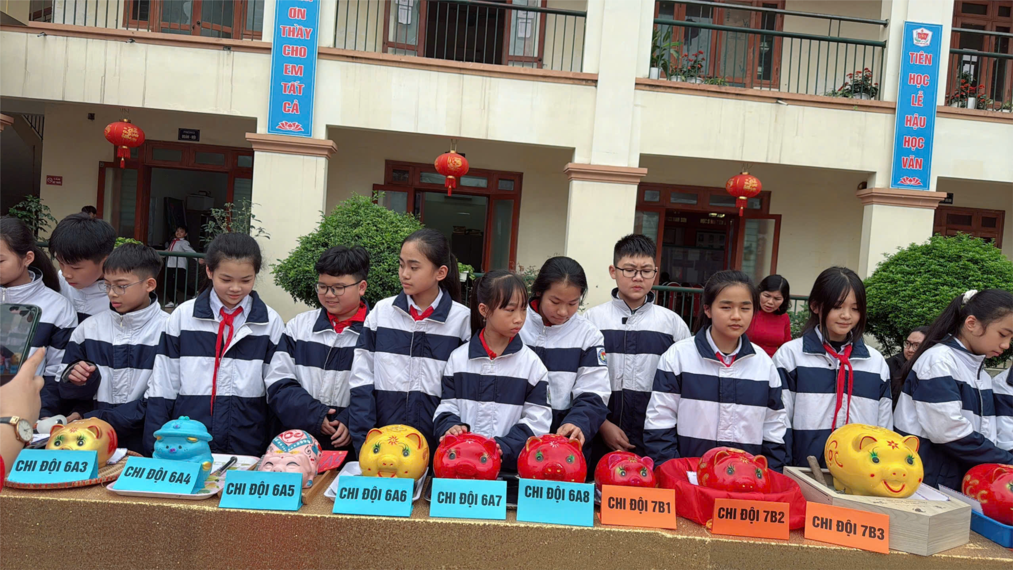Trước khi nghỉ Tết Nguyên Đán, các lớp đã chuẩn bị những chú lợn đất để tự nuôi, tự quản và chăm sóc. Hàng ngày, hàng tuần, các bạn cùng nhau tiết kiệm tiền mừng tuổi của bản thân để “vỗ béo” cho chú lợn đất của lớp. Việc ủng hộ này hoàn toàn tự nguyện, tự giác và tùy theo khả năng của mỗi học sinh. Với tấm lòng sẻ chia của tất cả học sinh, những chú lợn của các lớp đã tăng trưởng nhanh chóng và đạt số cân nặng thật ấn tượng.