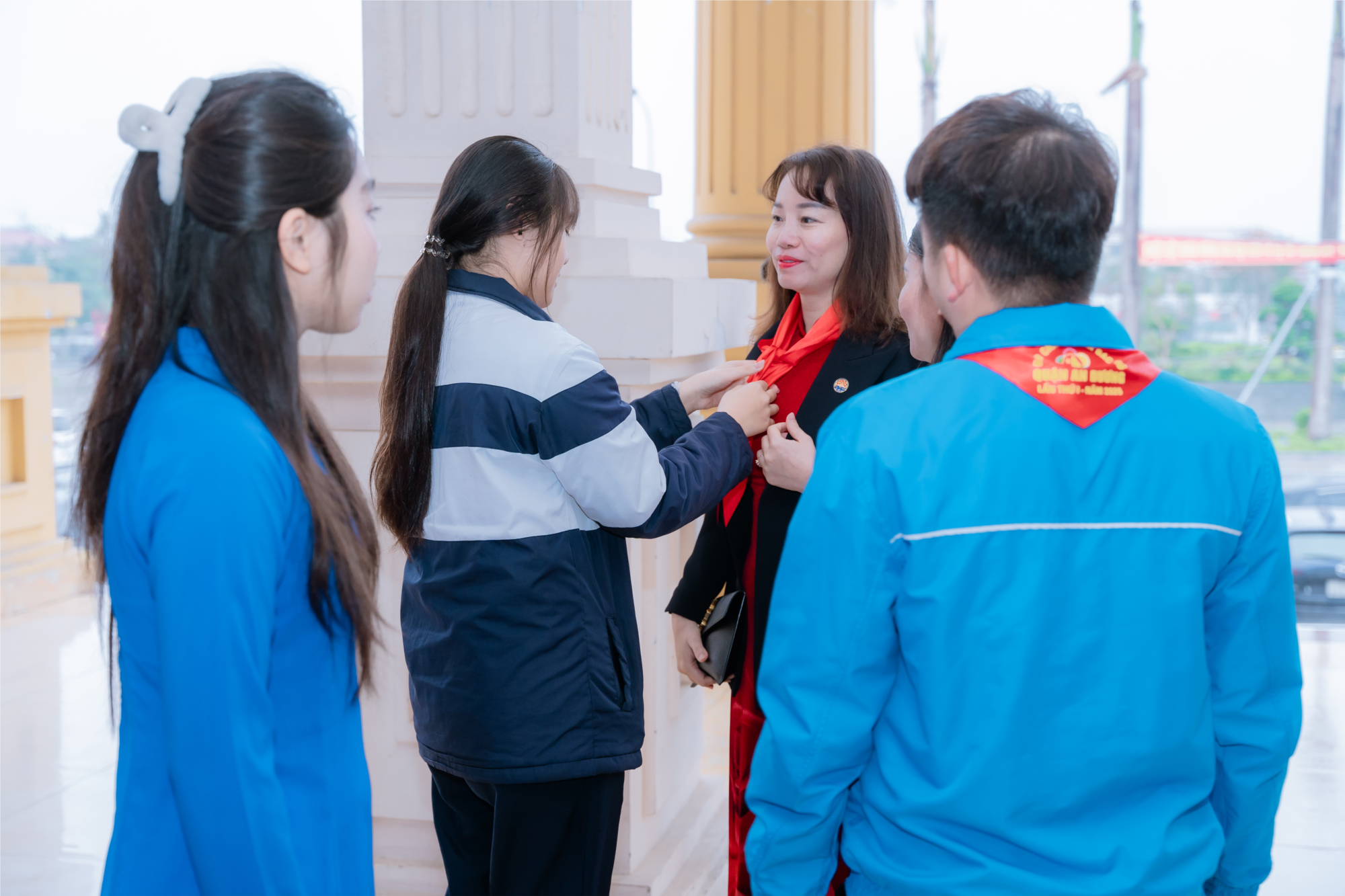 Các bạn học sinh đón tiếp và thắt khăn đỏ cho các cô bác đại biểu tham dự Đại hội
